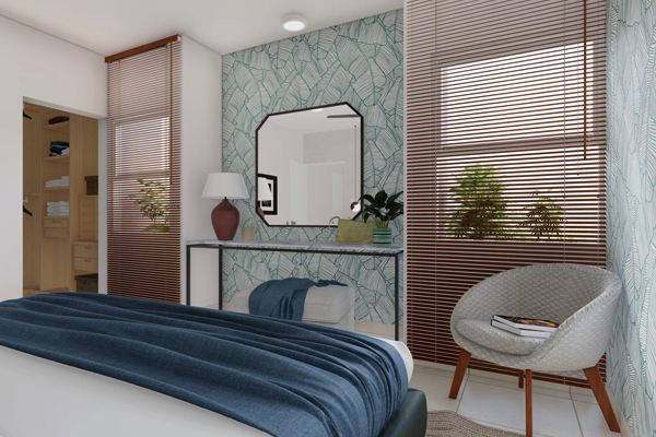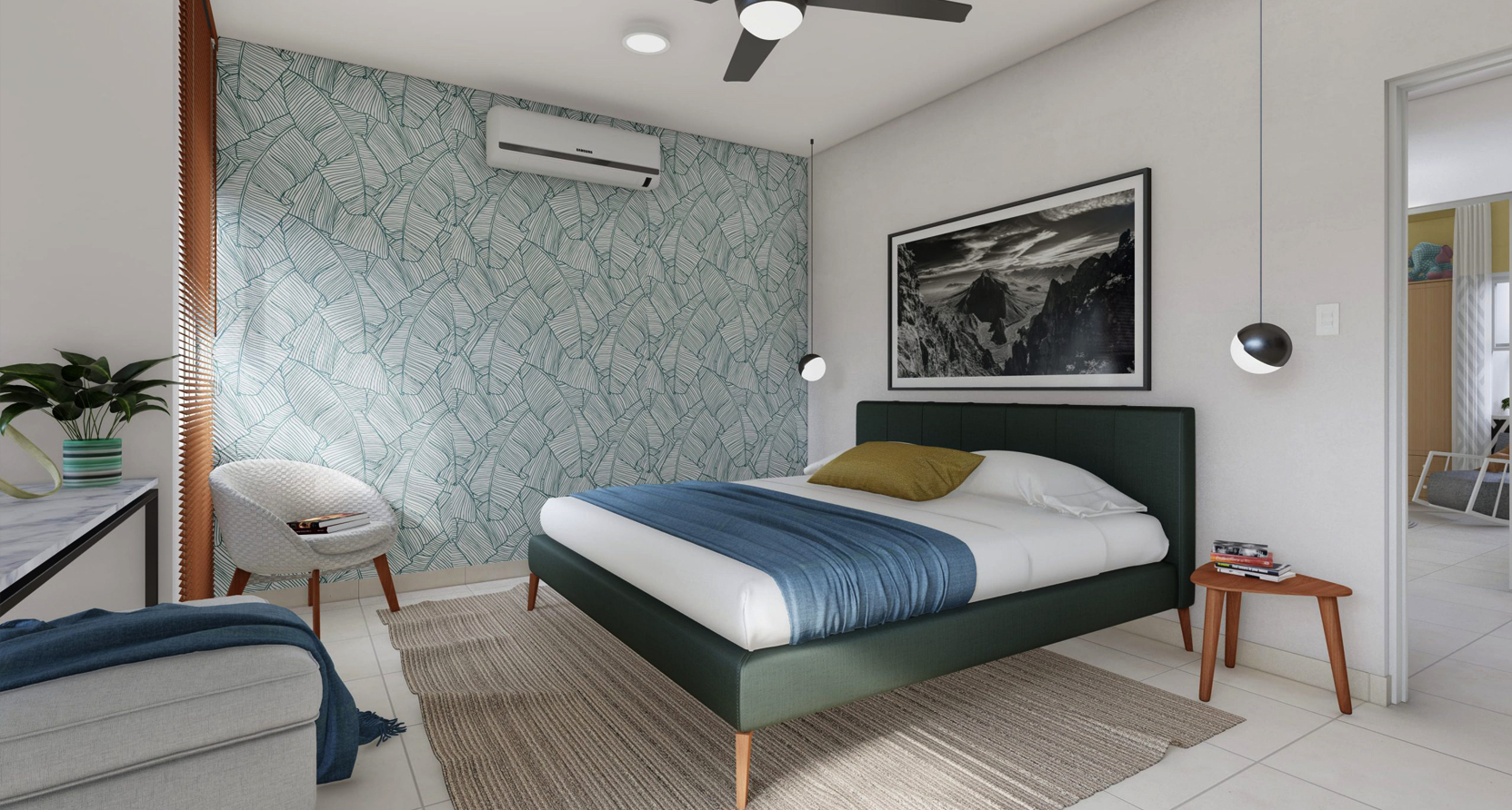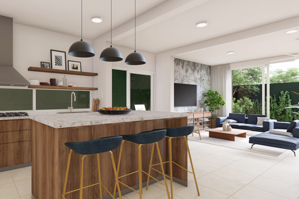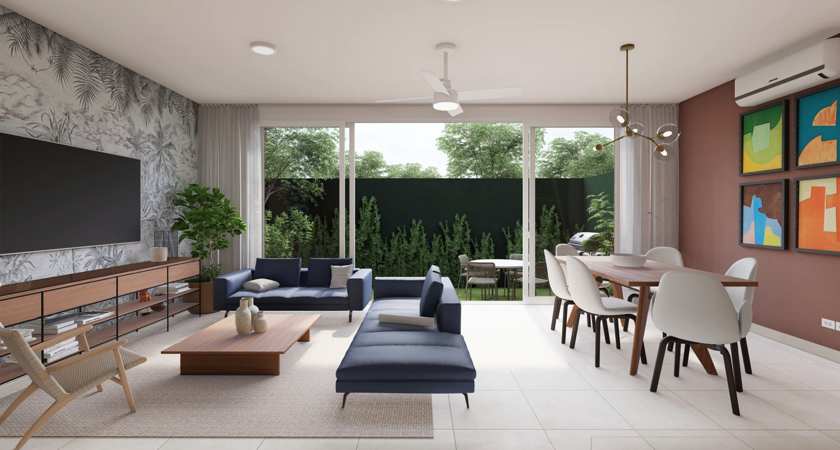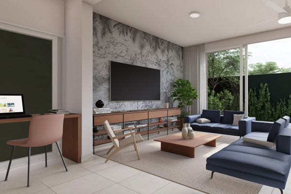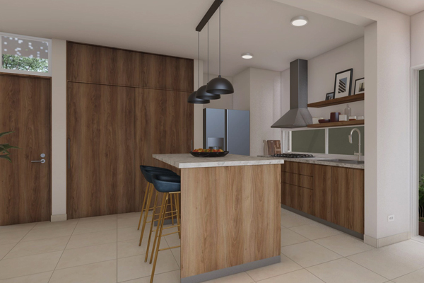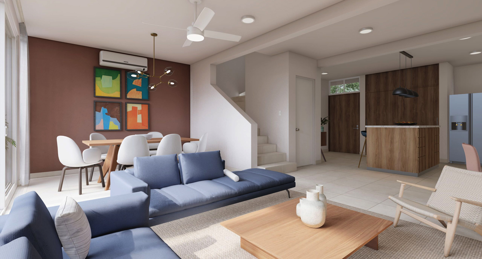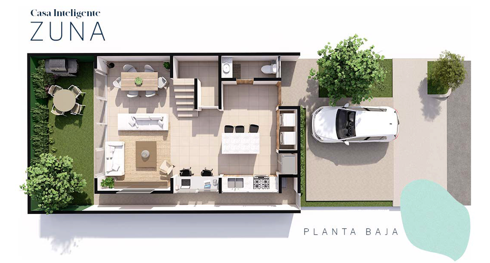 El modelo de Casa Inteligente Zuna se caracteriza por su moderno diseño interior con espacios abiertos para un mejor aprovechamiento de la luz natural y con 3 habitaciones.